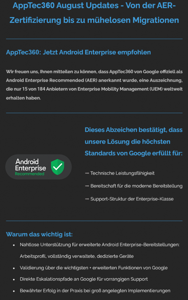 AppTec360 August Updates 27. August 2025 von Madro Webadmin AppTec360: Jetzt Android Enterprise empfohlen